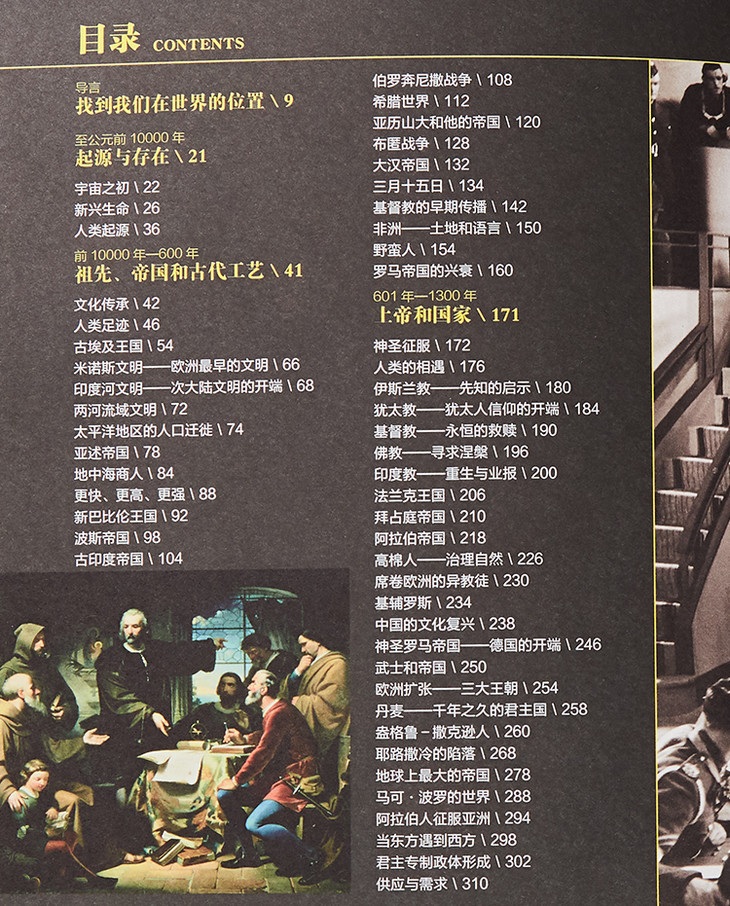 作者没有采用传统编年史写法,而是把人类历史分为9个时代,每个时代选择10个左右的代表性专题事件说明。
