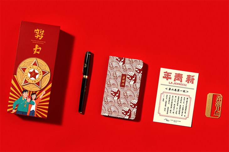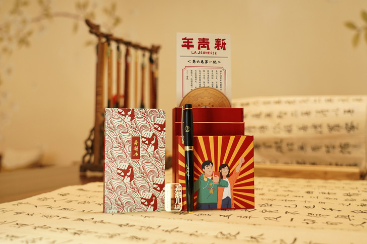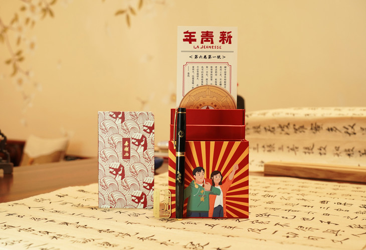 这套弄潮儿新华英雄钢笔礼盒设计颇具创意,设计团队是云进,投身文创领域已经四五年,还曾于盗墓笔记IP合作开发多款衍生品。