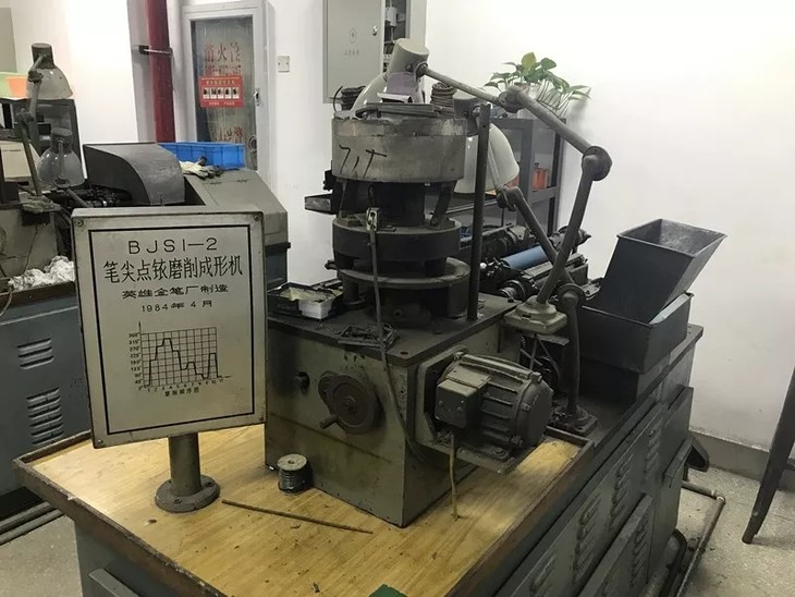 今日,在位于上海的英雄金笔厂,还可以看到1984年服役至今的机器——笔尖点铱磨削成型机,这是英雄金笔厂独家制造。